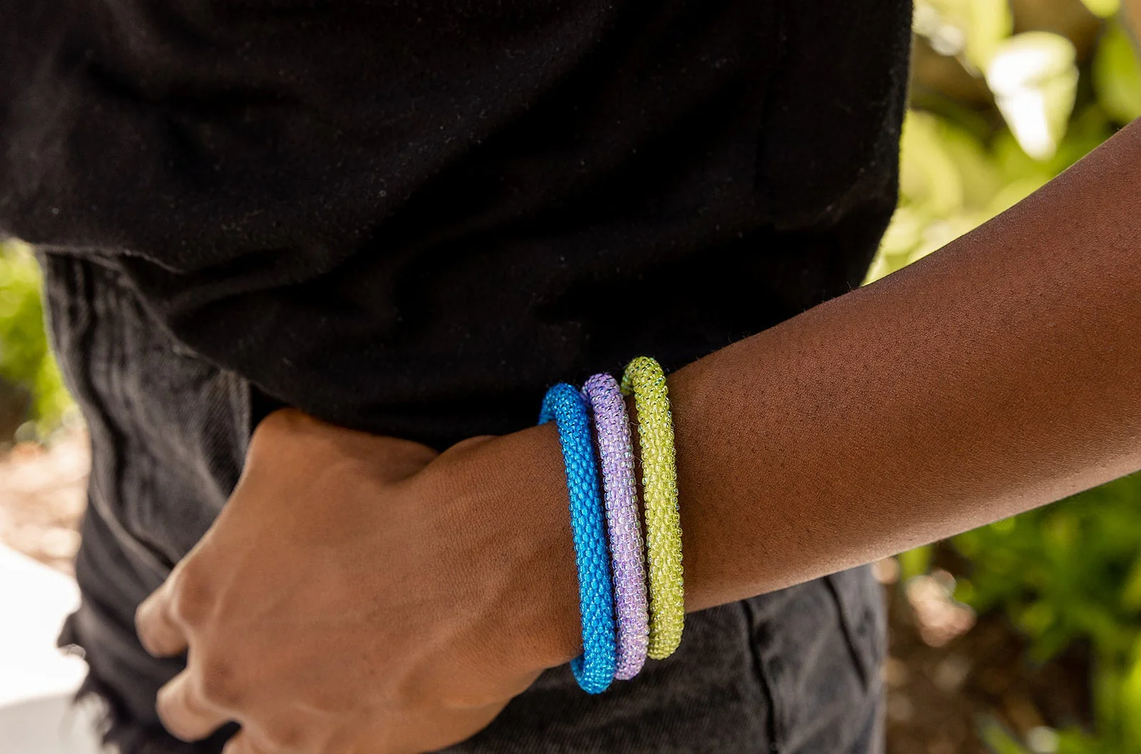 This Sashka Co glass beaded bracelet was hand-crocheted by a skilled artisan in the Kathmandu Valley of Nepal. It features a smooth roll-over design and a bold solid pattern in blue glass beads. Sashka Co. Bracelets make amazing friendship bracelets and support fair trade, helping women in Nepal rise above poverty.